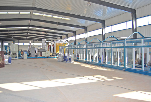 3PE纏繞作業線:采用靜電噴涂原理,潔凈且具有一定粗糙度的鋼管旋轉的通過中頻加熱室,使管體達到一定溫度后,隨即進入粉末噴涂室,利用流化床、靜電發生器及噴槍向鋼管表面噴涂形成所需的涂層厚度;再通過擠出機,分別擠出膠粘齊、聚乙烯纏繞到螺旋前進的鋼管上。再經水冷系統、在線檢測,管端打磨,即為成品管。